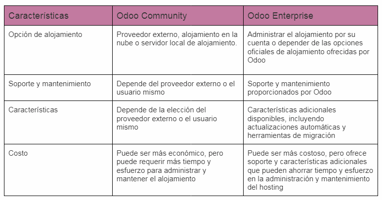 - Si tienes un presupuesto limitado y no puedes pagar por Odoo Enterprise, prueba la versión community y opta por un alojamiento compartido o local más económico.
