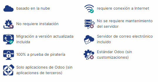 - En cuanto a la seguridad, Odoo en línea es completamente seguro para evitar a los hackers maliciosos, y también es compatible con futuras migraciones a versiones actualizadas.