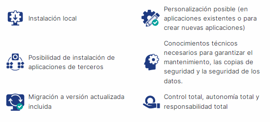 Al elegir esta opción de implementación, será responsable de todo lo relacionado con la ejecución del software. Es decir, tendrá que adquirir la infraestructura de red, la energía, los servidores, el sistema operativo, entre otros. Además, tendrá que mantener todas las infraestructuras necesarias para que el software funcione correctamente, esté seguro y actualizado.